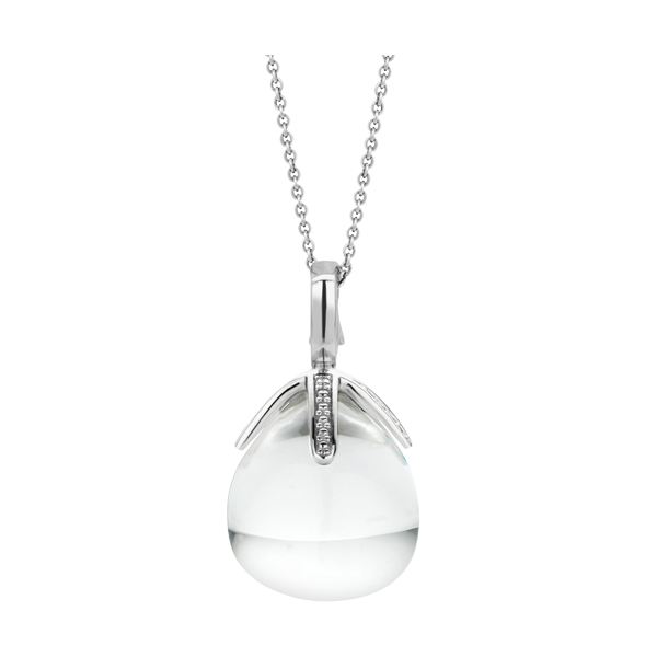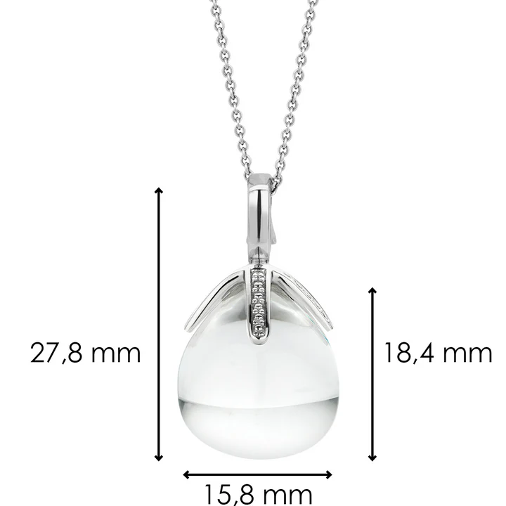 Logo à primeira vista, o pingente em cristal translúcido destaca-se pelo seu brilho suave e pela forma como reflete a luz de maneira subtil. Para valorizar ainda mais a peça, a corrente em prata de lei recebe um banho de ródio, o que lhe garante proteção contra riscos e um brilho duradouro. Assim, o colar mantém o seu acabamento impecável mesmo com o uso diário.