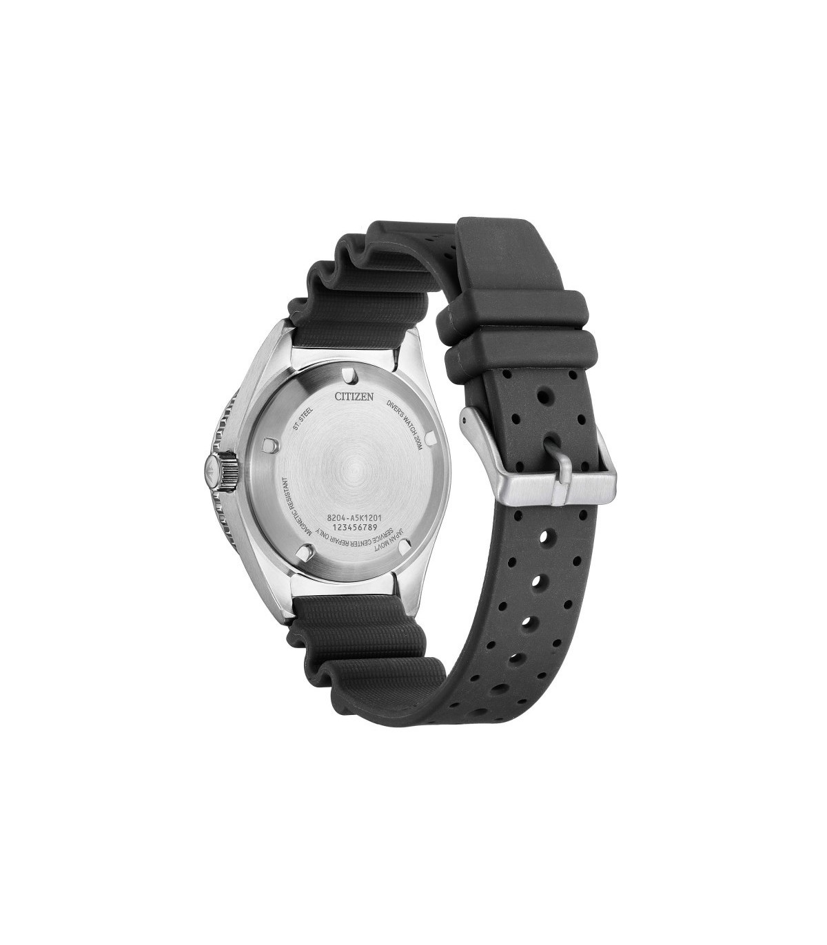 Enquanto isso, o movimento mecânico automático cal. 8204 dispensa o uso de bateria, oferecendo autonomia prolongada e manutenção mínima. Além disso, a dupla exibição de data às 3 horas permite uma leitura prática e rápida, ideal para o dia a dia e atividades subaquáticas. Por isso, é perfeito para quem busca precisão e conforto ao mesmo tempo.