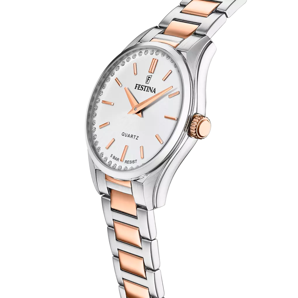 Primeiramente, o Festina F20620/1 apresenta uma caixa redonda de 36 mm de diâmetro, que se ajusta perfeitamente ao pulso feminino. Fabricada em aço inoxidável e com revestimento PVD em tom de ouro rosa, a peça exala sofisticação e modernidade. O mostrador prateado, decorado com cristais e cortes em raios de sol, adiciona um brilho sutil, tornando o relógio ainda mais atraente. Dessa forma, ele combina elegância e charme, destacando-se de forma discreta, mas impactante.
