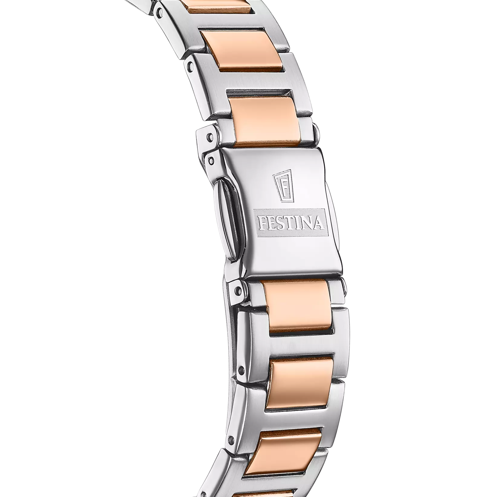 O Festina F20620/1 também se destaca pelo conforto. A pulseira de aço inoxidável revestido em PVD oferece um ajuste perfeito, sendo confortável para o uso diário. O fecho de duplo botão garante que o relógio se mantenha seguro no pulso o tempo todo. Além disso, o movimento de quartzo assegura precisão, evitando que você tenha que se preocupar com ajustes constantes.