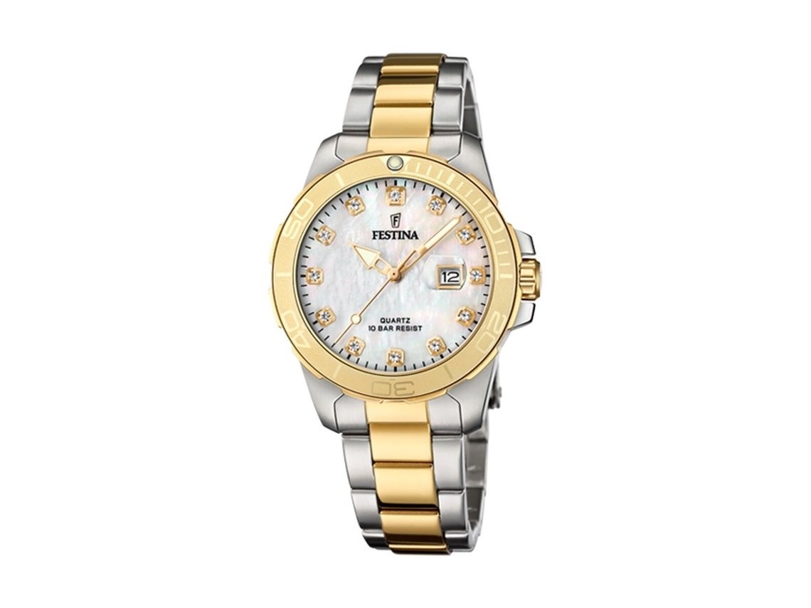 Este relógio Festina Boyfriend F20504/2 tem uma caixa de Inox com um diâmetro de 34 mm e está equipado com uma bracelete de metal. A caixa possui um movimento Miyota e o relógio tem um vidro Mineral.