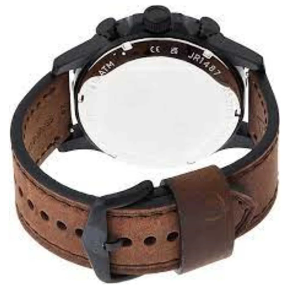 A caixa redonda de 50 mm em aço preto confere presença e durabilidade ao relógio. Por outro lado, a bracelete em couro castanho proporciona conforto e ajuste perfeito ao pulso. Assim, o Nate JR1487 une resistência e estilo em um único acessório.