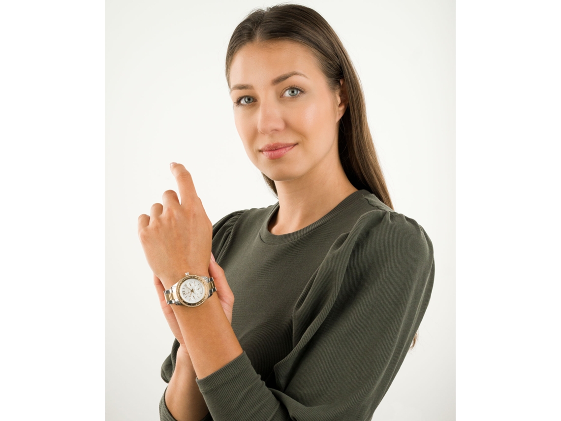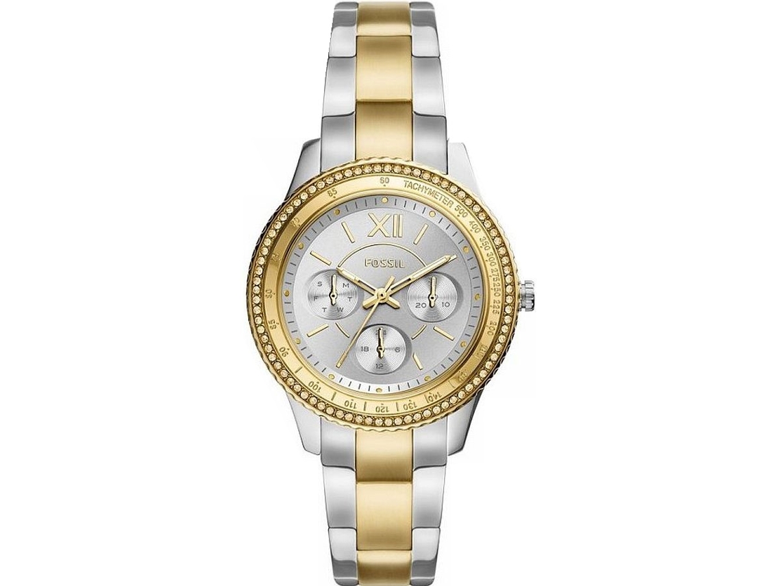 A bracelete bicolor em aço inoxidável confere um toque único e moderno ao relógio, sendo um acessório versátil que pode ser combinado com qualquer look. O FOSSIL STELLA SPORT ES5107 possui também uma prática função de visualização da data, permitindo-lhe acompanhar facilmente o dia e a data.