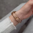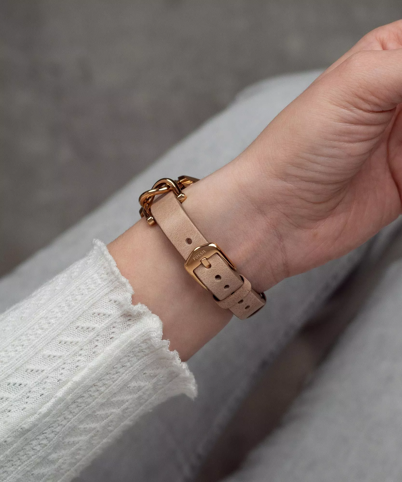 O Fossil Riley ES3466 possui uma caixa de aço inoxidável dourado com 3,8 cm de diâmetro e 1,1 cm de espessura, conferindo um visual sofisticado. O mostrador bege harmoniza perfeitamente com os marcadores dourados em algarismos arábicos e não numéricos, proporcionando elegância e legibilidade. Além disso, a pulseira combina couro e aço inoxidável na cor bege, garantindo conforto e durabilidade.