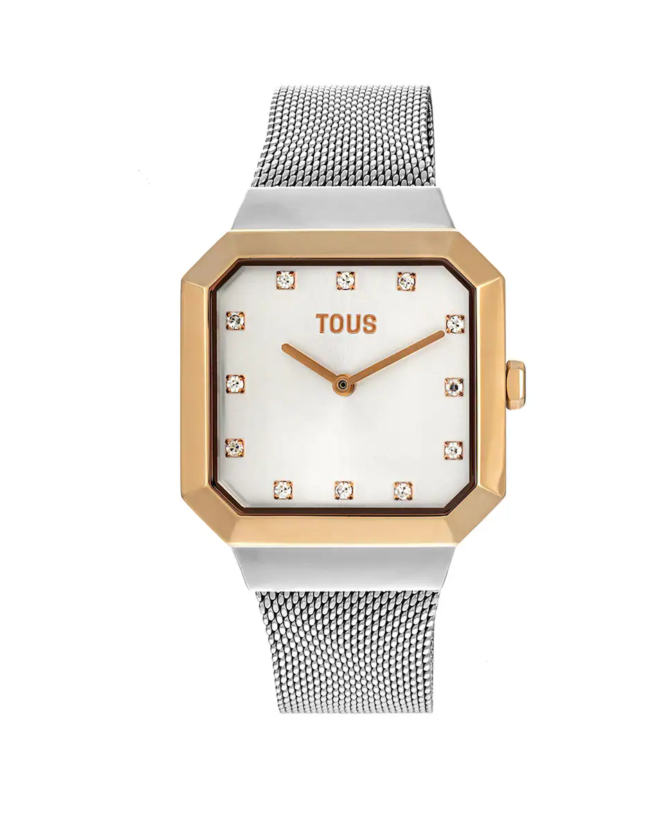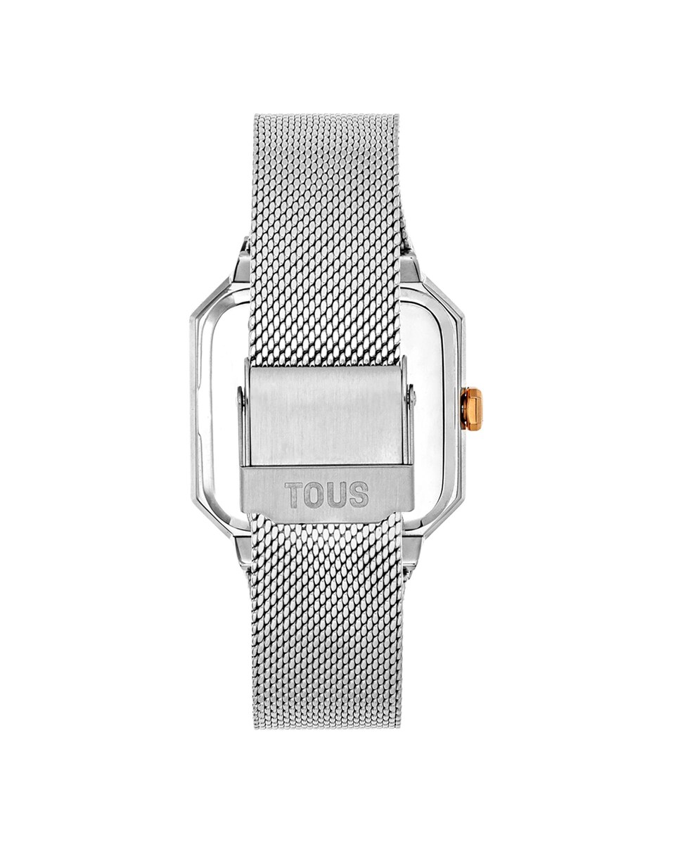 O Relógio TOUS  possui uma caixa retangular em aço inoxidável, com acabamento prateado que transmite sofisticação e modernidade. Além disso, o mostrador também em tons prateados harmoniza com a caixa, criando um visual discreto e sofisticado. Com um diâmetro de 40 mm, o relógio TOUS  é marcante no pulso, mas também leve e confortável.